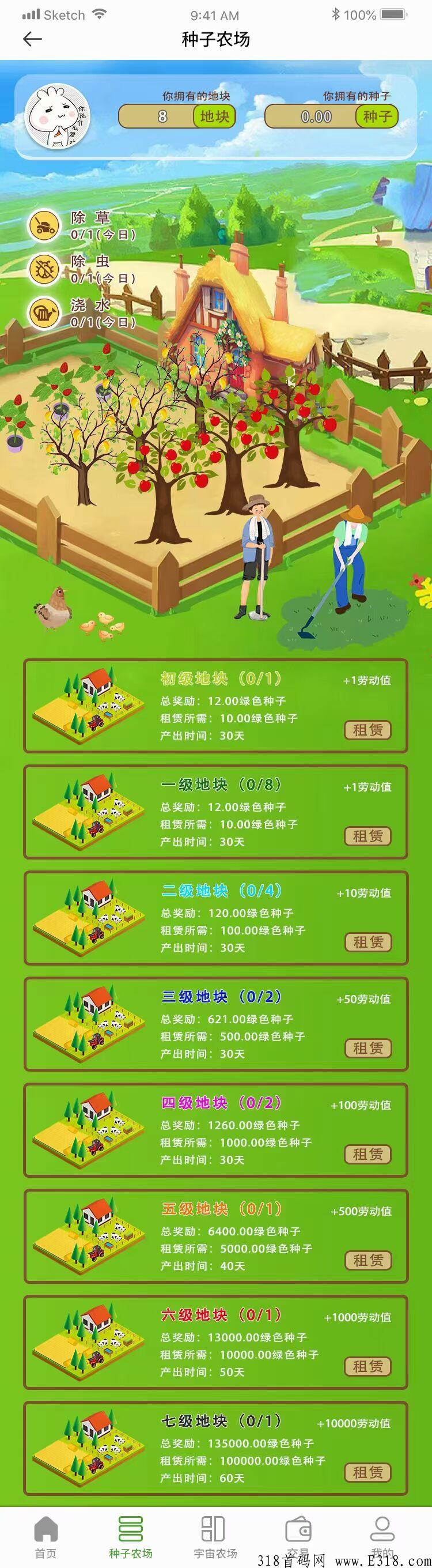任务包:月产12,10复投月产13,同时拥有8个;手续费:默认50,推5降为38%直推收益:3%认证:我的,实名认证任务:点种子农场:除草,除虫,浇水,3个广告,每看完一个广告有一个插屏广告,可以直接叉掉!一星:直推20,团300,奖励一星任务包,交易分红8%