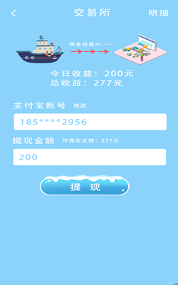 保底分红板块:嘀嗒船长有很多玩法和收益环节,轮船越多,每日租金收益越多。平台每天会拿出一部分广告收益发放给玩家作为基础租金分红奖励,每个玩家保底每天可以领5元基础租金分红,可体现到账。
