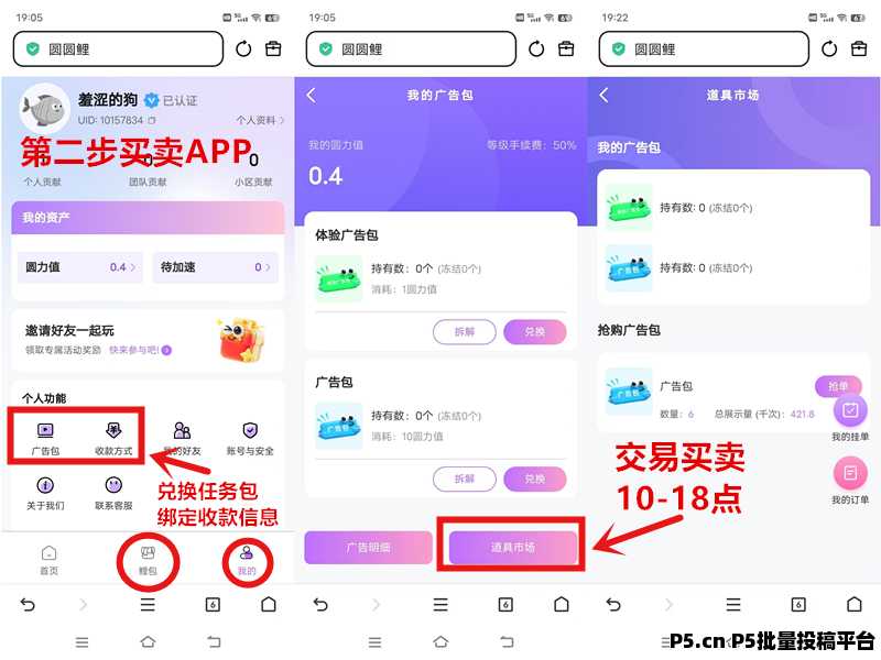 五、我的-广告包-道具市场(买卖圆力)10:00-18:00,我的-设置收k信息